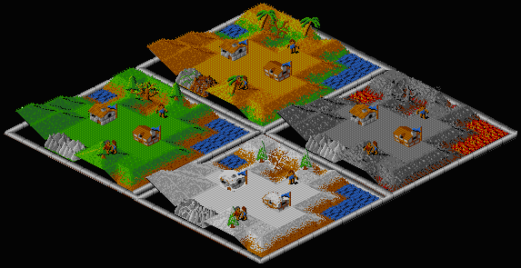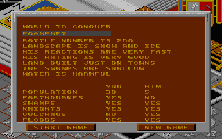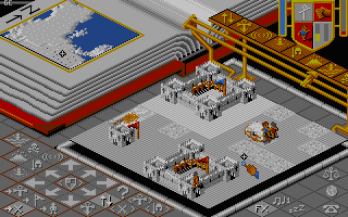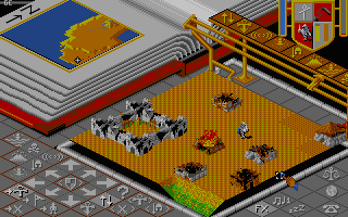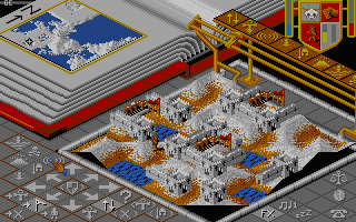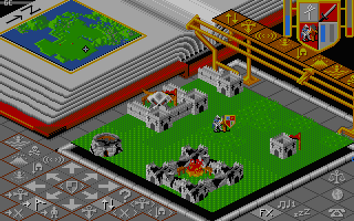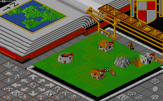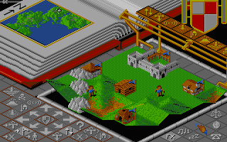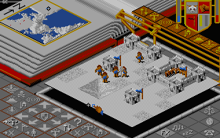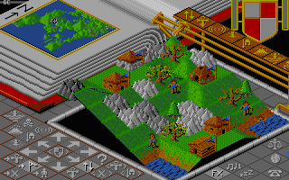 Populous II hat einen großen Vorteil gegenüber dem ersten Teil: Man kann in einen Vollbildmodus umschalten, so dass die Spielwelt nicht mehr in einem winzigen 8×8-Felder-Ausschnitt dargestellt wird sondern über den gesamten Bildschirm, mit einer Menüleiste an der Seite.