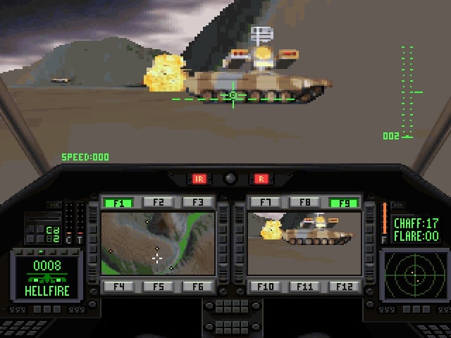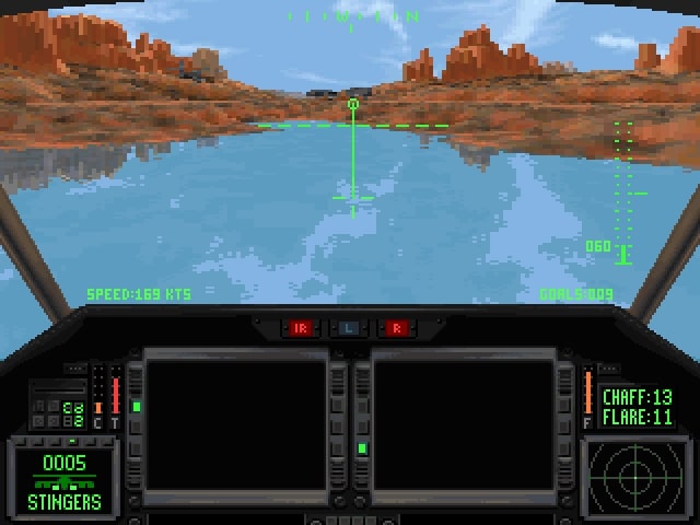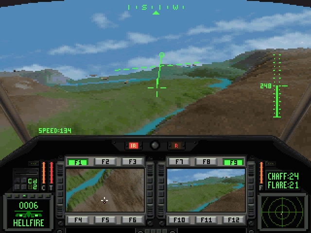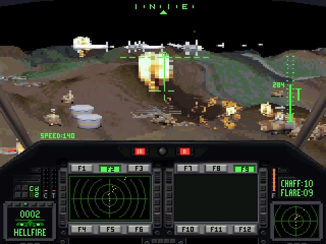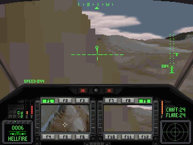 Schließlich gab es in Comanche 3 dann auch Bäume, Gebäude und ich meine sogar Telegrafen- und Strommasten. Es war zudem möglich mit einer realistischeren Steuerung zu fliegen, bei der der Abstand zum Boden nicht mehr automatisch eingehalten wurde.