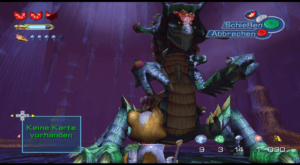 [1:14:30] Der zweite Boss ist Dracor. Das ist so ein fliegender, sehr böse aussehender Drache. Und hier merkt man schnell, dass das ein Rail-Shooter-Abschnitt ist. Also hier fliegt man diesem auf uns schießenden Drachen hinterher. Das fand ich okay. Also mir macht das Spaß. So die Flugbahn und so ist alles automatisch vorgegeben. Und ich muss halt ein bisschen zielen und ballern. Das hat mir ganz gut gefallen. Zumal es sich wirklich auch abhebt von dem ersten Kampf gegen Geldon, der dann zwar schon ein paar Stunden zurückliegt, Aber du erinnerst dich schon noch daran, weil Bossfights eben so rare Highlights in diesem Spiel sind. Also es gibt einfach nicht so viele. Und ich finde das ganz gelungen.