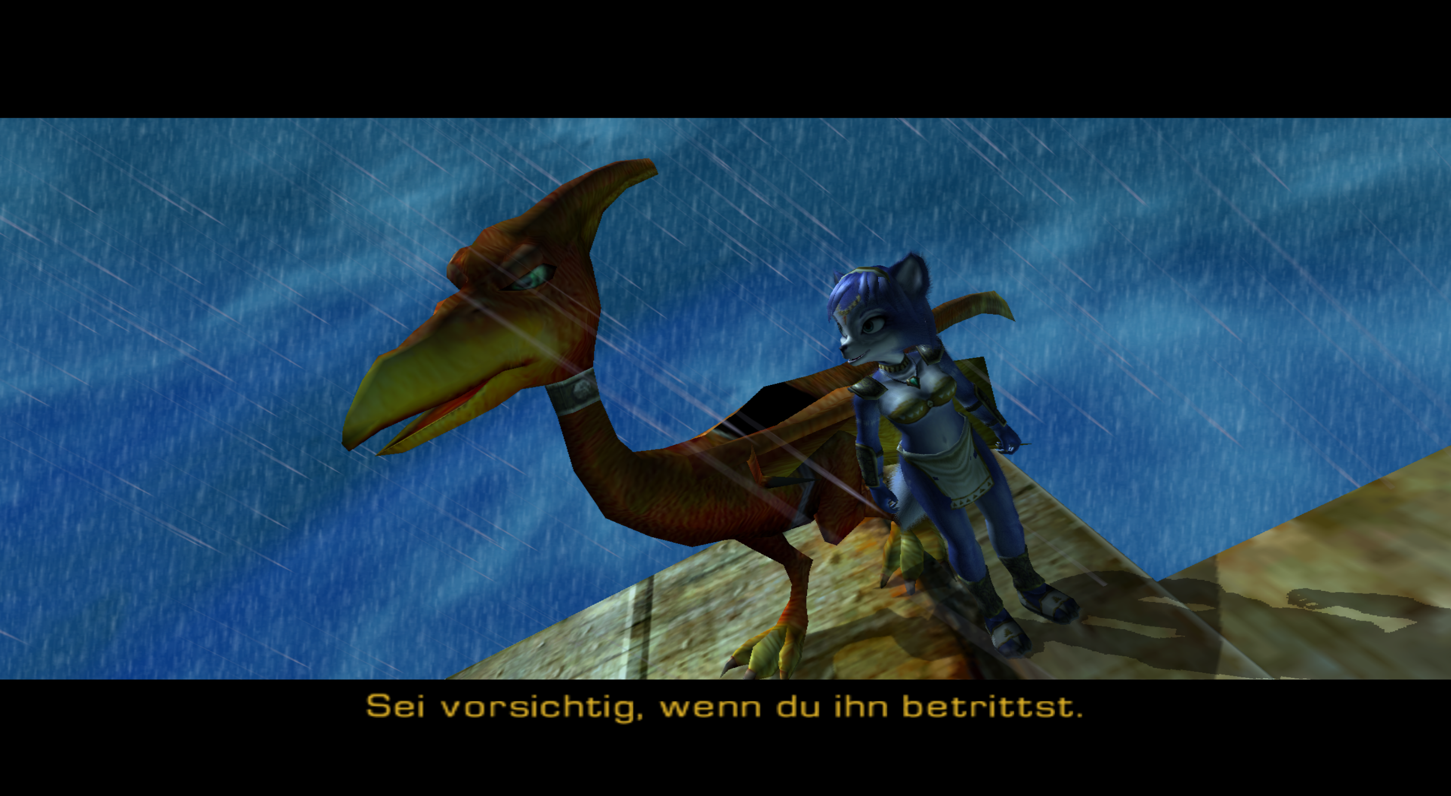 [40:24] Ich erzähle mal so ein bisschen nach, was hier im Prolog im Spiel passiert. Es ist Nacht, düster und verregnet. Ein eingeblendeter Text verrät uns, dass ein Mädchen namens Crystal irgendwo aus den Tiefen des Alls stammt, unterwegs ist, um die Wahrheit hinter dem Tod ihrer Eltern herauszufinden. Kleiner Spoiler an der Stelle besagt, Eltern und deren Ableben, die werden im Spiel rein gar keine Rolle mehr spielen. Auf jeden Fall fliegt Crystal gerade durch das sogenannte Lylat-System. Als sie einen Notruf vom Dinosaur Planet erreicht. Und jetzt macht die Kamera einen Schwenk vom Nachthimmel zur Heldin. Und wir sehen, Crystal ist eine Art Katzenwesen. Und die fliegt nicht etwa in einem Raumschiff, sondern auf einem geflügelten Dinosaurier. Und sie redet in einer für uns unverständlichen Sprache mit ihrem fliegenden