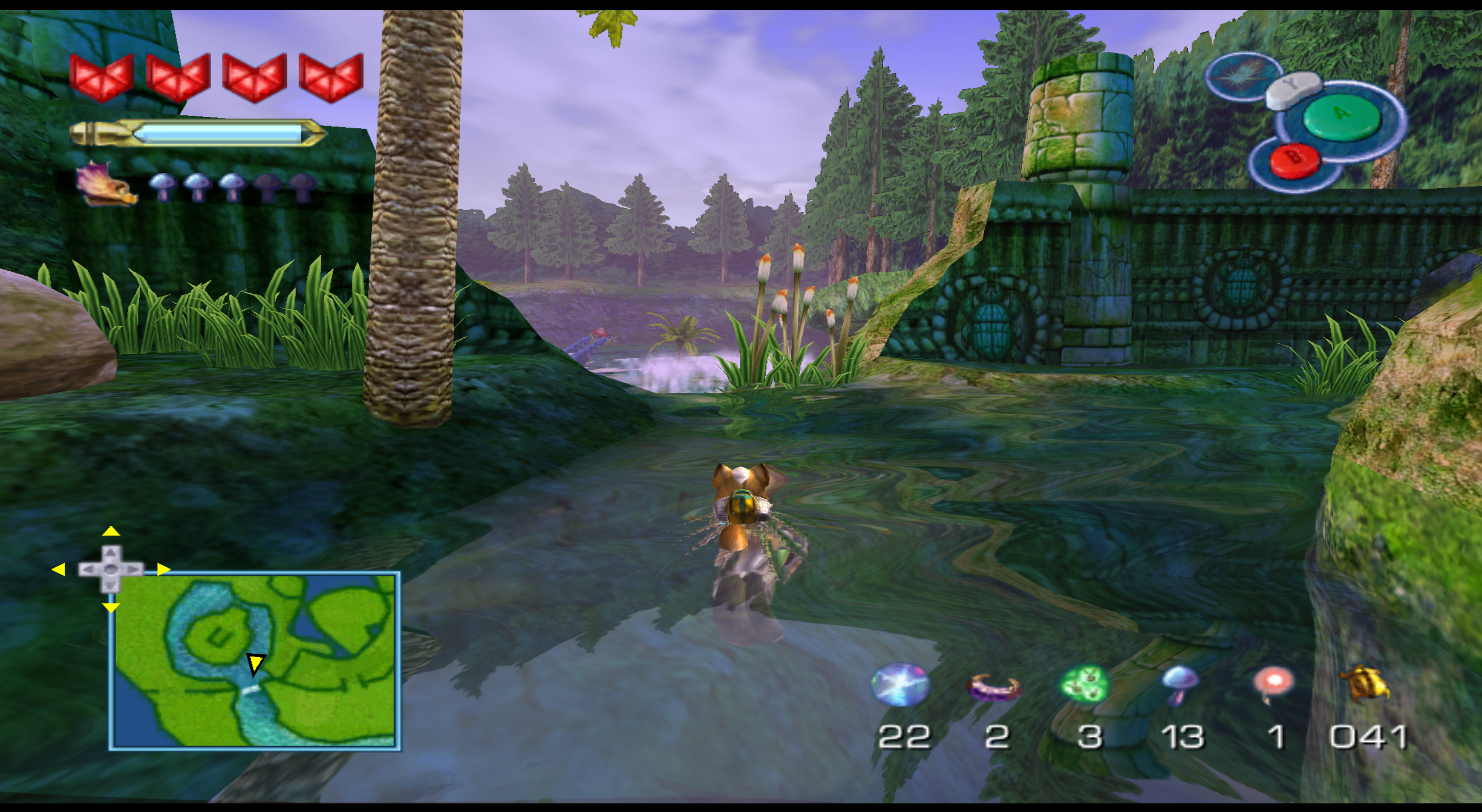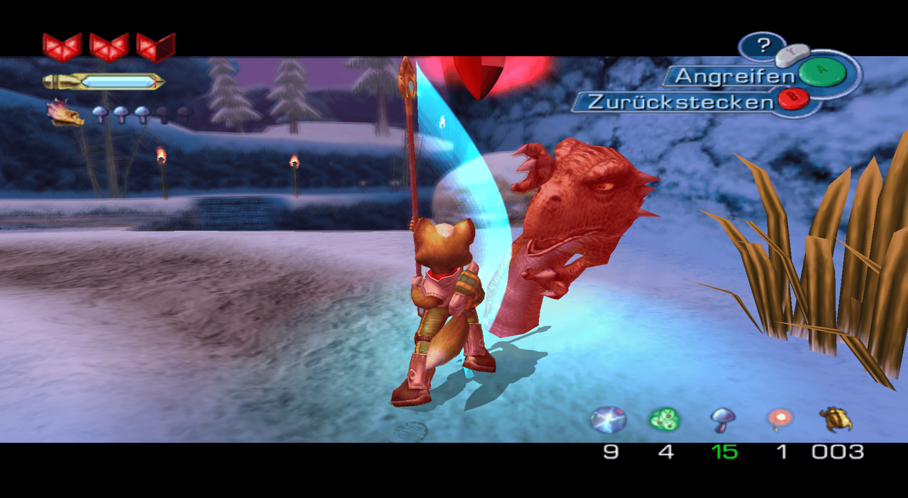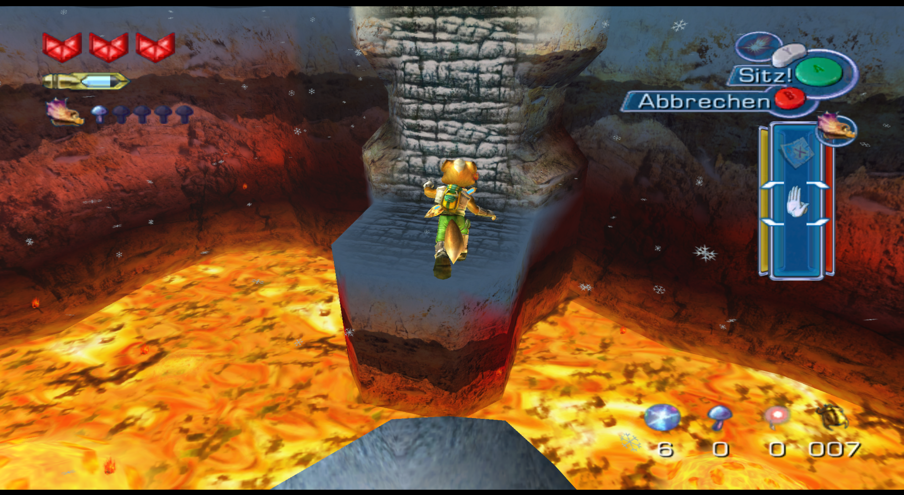 Die Idee, durch Einblenden des C-Buttons in der Spielwelt anzuzeigen, dass hier kontext-sensitiv ein Item einzusetzen ist (und dass dies des „Rätsels“ Lösung ist), tötet jeden Spielspaß. Beispiel Sprengung: Ja, rein mechanisch tue ich in vielen Action-Adventures nichts anderes. Jedoch bei Starfox Adventures kann ich mit den Fähigkeiten nicht experimentieren. Wenn ich etwas sprengen darf, dann nur genau hier und nach Aufforderung; das nimmt mir jedes Gefühl von Wirkmächtigkeit. Klar, wie Gunnar schon gesagt hat, es ist nur ein Schlüssel. Problem nur: Das ist keine nett inszenierte Dreingabe, sondern stellt schon wesentliches Gameplay dar.