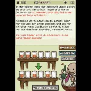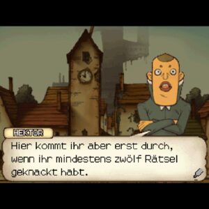 [11:47] Und dieser Denkspiel-Appeal von Gehirnjogging, der wirkt auch nach auf unser heutiges Thema, Professor Layton und das geheimnisvolle Dorf. Das ist ja per Definition ein Adventure, wenn man diese Spielart als Verkettung von Rätseln verstehen möchte, die man auf dem Weg vom Start zum Ziel bewältigen muss. Aber es geht hier auch stark eher, und das sagt auch die Packung schon, um Denksportaufgaben. Das würde ja bei einem Monkey Island würde ja vielleicht noch hinten draufstehen auf der Packung, dass es Rätsel drin sind, aber nie, dass es Denksportaufgaben sind. Und hier werden die Rätsel auch immer schon als Denkaufgaben oder Denksportaufgaben geframed. Das Spiel hat 120 Story-Rätsel, die muss man nicht alle lösen, aber einen Großteil davon schon.