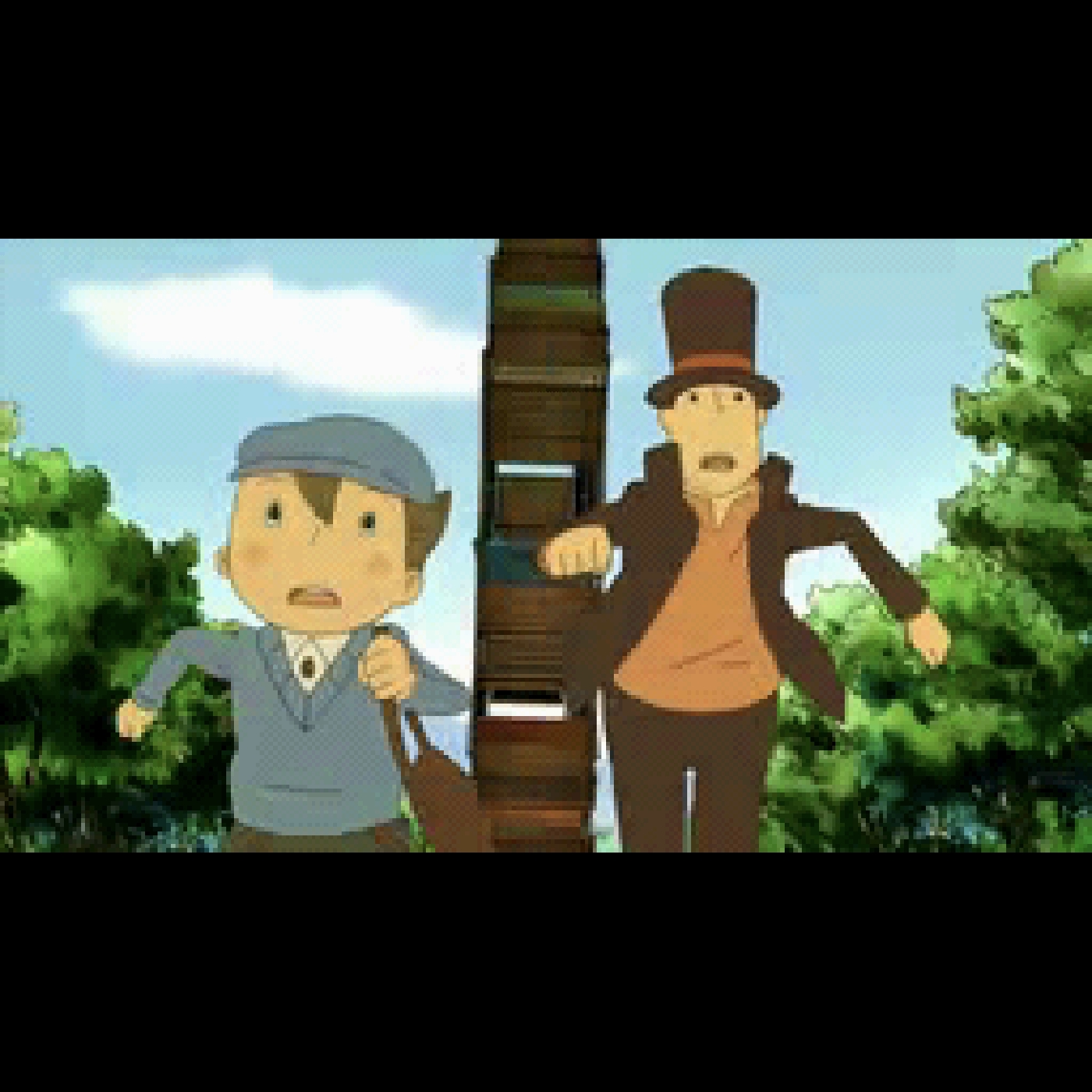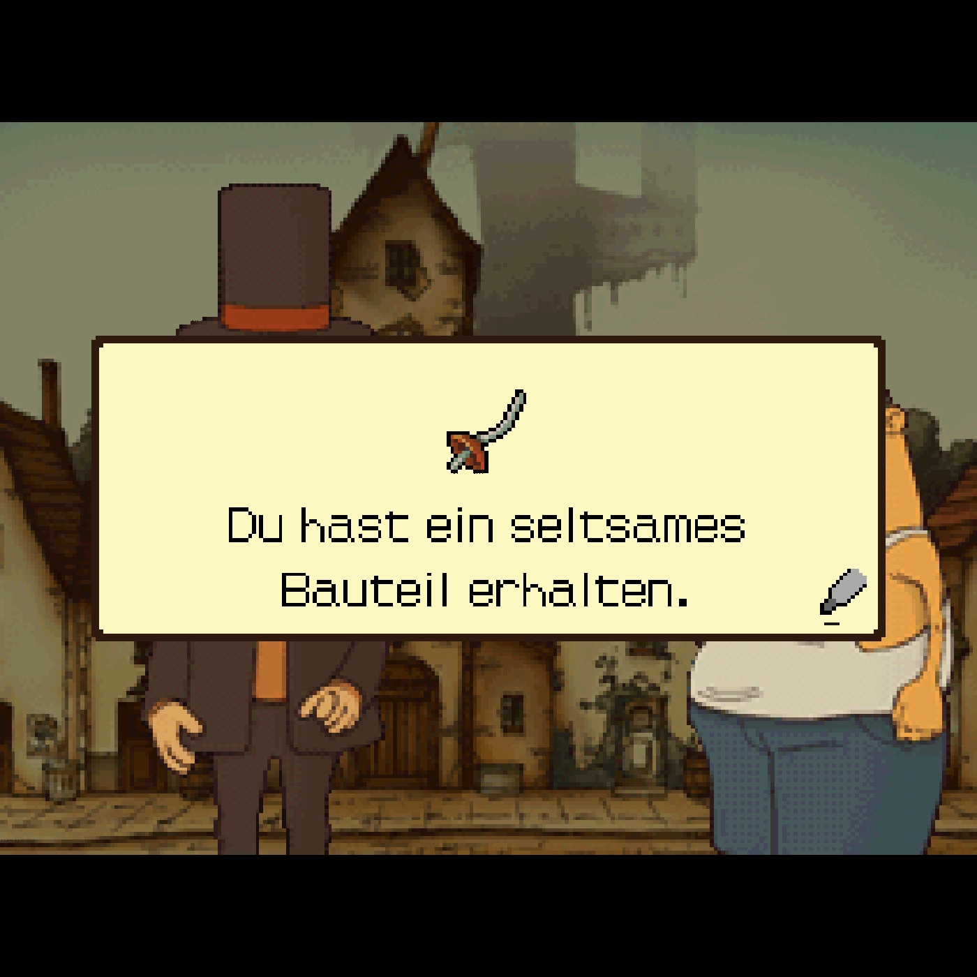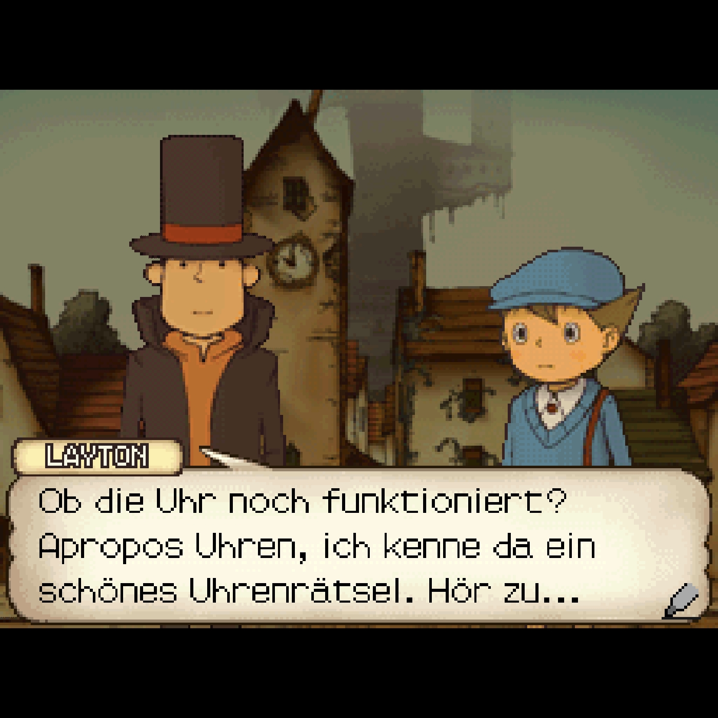 [1:10:51] Was ich besonders auffällig fand bei der Grafik ist diese klare visuelle Rollenverteilung. Professor Layton und Luke sind extrem normal gezeichnet, sind klar proportioniert, sind ruhig, haben kaum überzeichnen, fast schon ein bisschen langweilig. Gerade der Layton selber hat so ein sehr einfaches Gesicht. Das ist aber ihre Funktion. Das habe ich erst nach einer Weile im Spiel verstanden, nachdem ich das so ein bisschen gewundert hat.