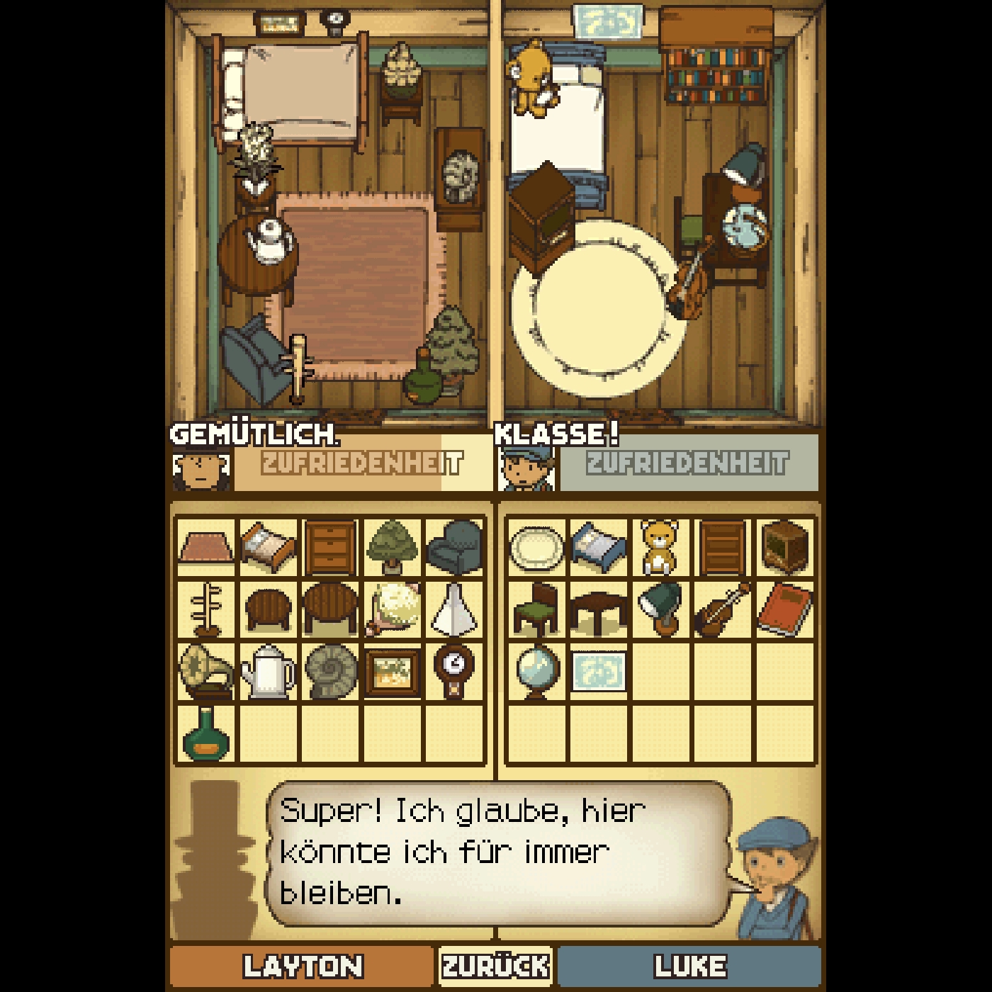 [1:08:20] Und manche schenken mir auch sowas wie, ja, hier ist eine Zimmerpflanze oder ein Globus oder ein Stuhl, den ich nicht mehr brauche. Und damit kann man sich die Räume von Leighton und Luke in der kleinen Pension in seinem Mysterio einrichten, auch auf einem Minispielbildschirm. Und dann siehst du immer an den Aussagen und so einem Zufriedenheitsbalken, wie gut das den beiden jeweils gefällt und es geht darum, diese Zimmer möglichst komplett auszustaffieren mit genau den Sachen, die die eben gerne haben wollen bei sich. Also der Layton weiß vielleicht so einen Ohrensessel jetzt mehr zu schätzen