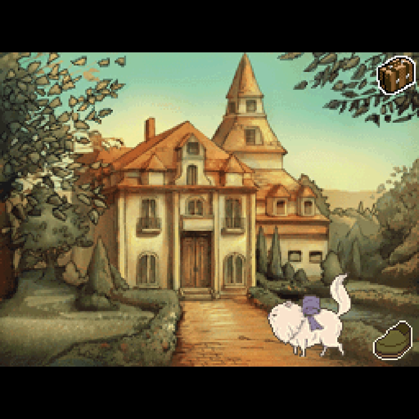 [33:19] Und wir sehen auf der Straße, auf der wir uns befinden, zwei NPCs stehen. Das ist eine ältere Dame namens Ingrid und einen etwas mürrisch aussehenden Mann, Der heißt Schnurrbert, typische Nintendo-artige Namensübersetzung der damaligen Zeit. Also es bezieht sich natürlich auf seinen exquisiten Schnurrbert, den er trägt. Und diese beiden Figuren, die können wir antippen. Und wir erfahren noch ein paar wesentliche Dinge zu seinem Mysterium. Zum Beispiel, dass der Ort eben bekannt ist für seine Rätsel, von denen uns hier gleich auch nochmal welche gestellt werden. Und dann endet auch schon dieser Prolog und das erste Kapitel beginnt. Wir sind jetzt mittendrin in diesem verschrobenen kleinen Ort, irgendwo in der Provinz eines alternativen Frankreichs. Und wir machen uns auf zur Villa von Dahlia. Das ist die Witwe des Barons, den du vorhin erwähnt hast. Und sie hat uns nach Salmistair eingeladen, um dem Geheimnis dieses goldenen Apfels nachzuspüren.
