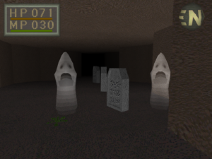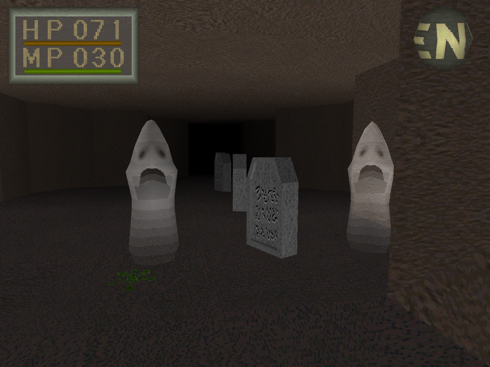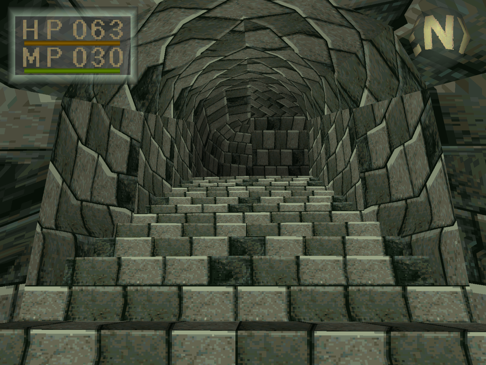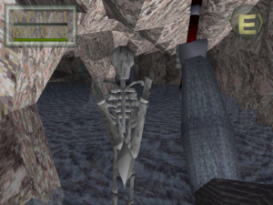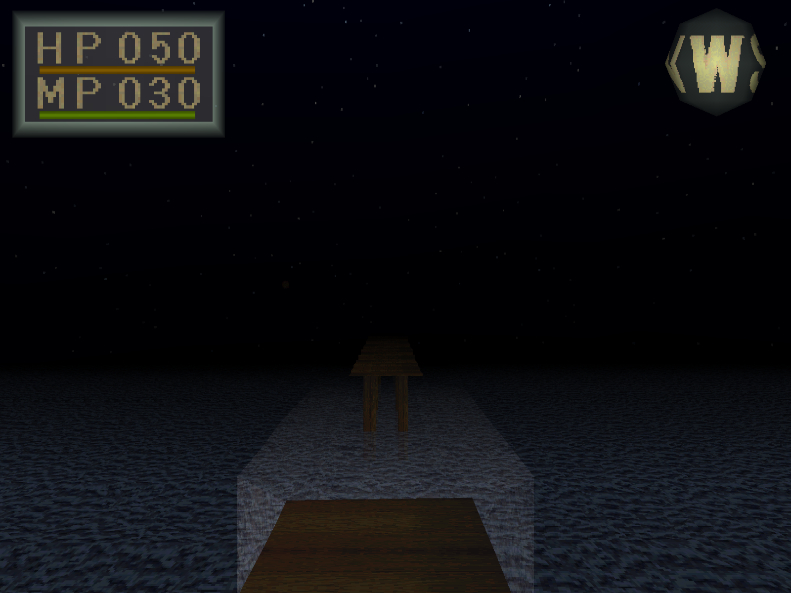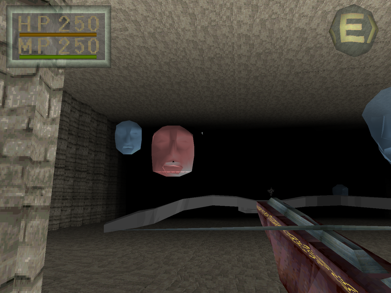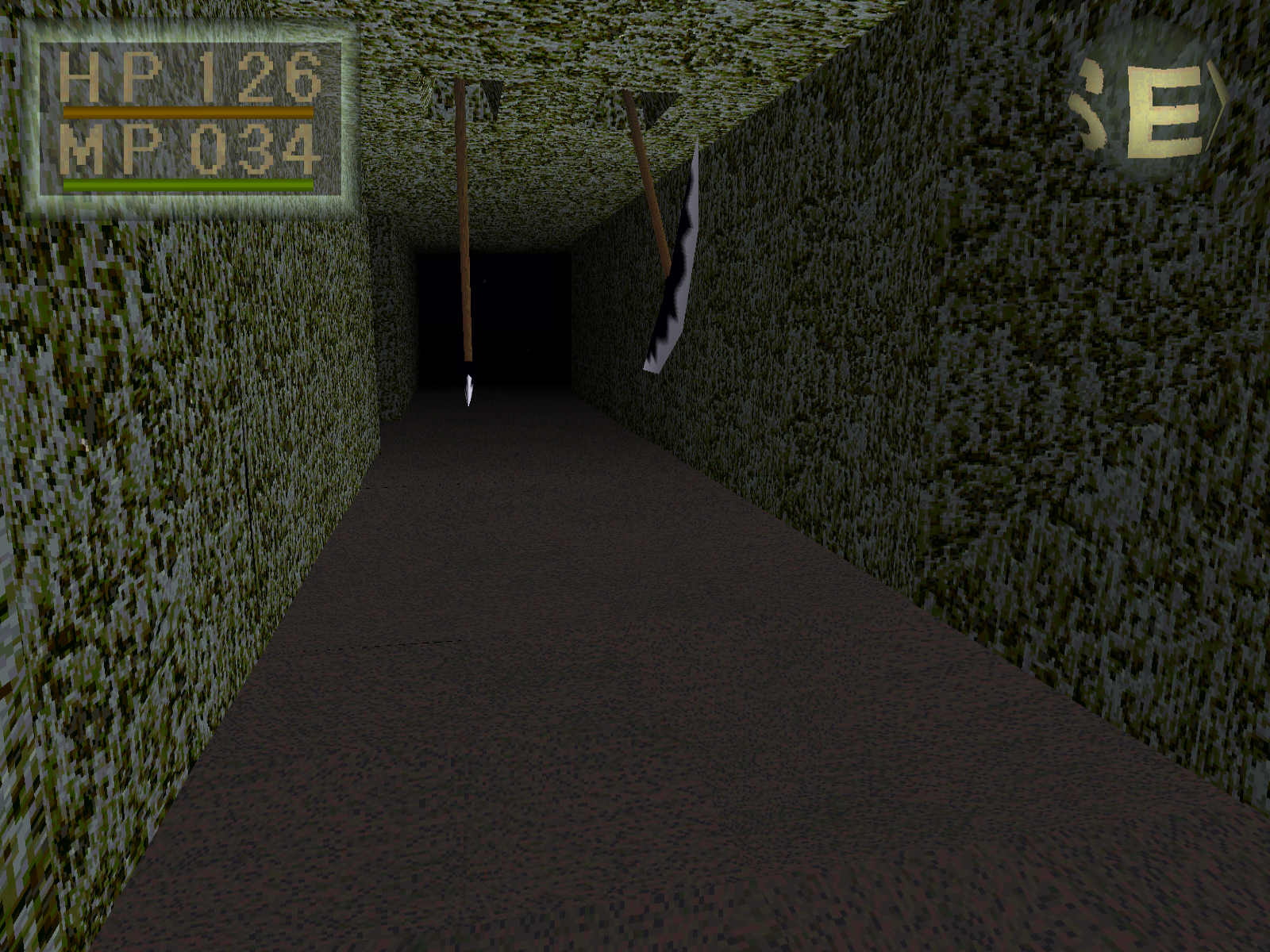 [9:32] Und dann steht man so da und sieht, ah, es ist ein 3D-Spiel aus der Ego-Perspektive. Perspektive, also durchaus damals ungewöhnlich auf einer Konsole. Das heißt, wir sehen hier viele Polygone, auch an den Monstern, die uns reichlich begegnen werden. Es gibt texturierte Umgebungen und wir merken, obwohl wir ein Schiffbrüchiger sind, haben wir offenkundig noch daran gedacht, uns schnell noch einen kleinen Dolch einzustecken, bevor wir untergehen. Denn es kommt auch schnell zu kämpfen. Denn es ist ein Spiel, was einen klaren Kampffokus hat. Darum auch diese Zuschreibung zum Genre des Action-Rollenspiels.